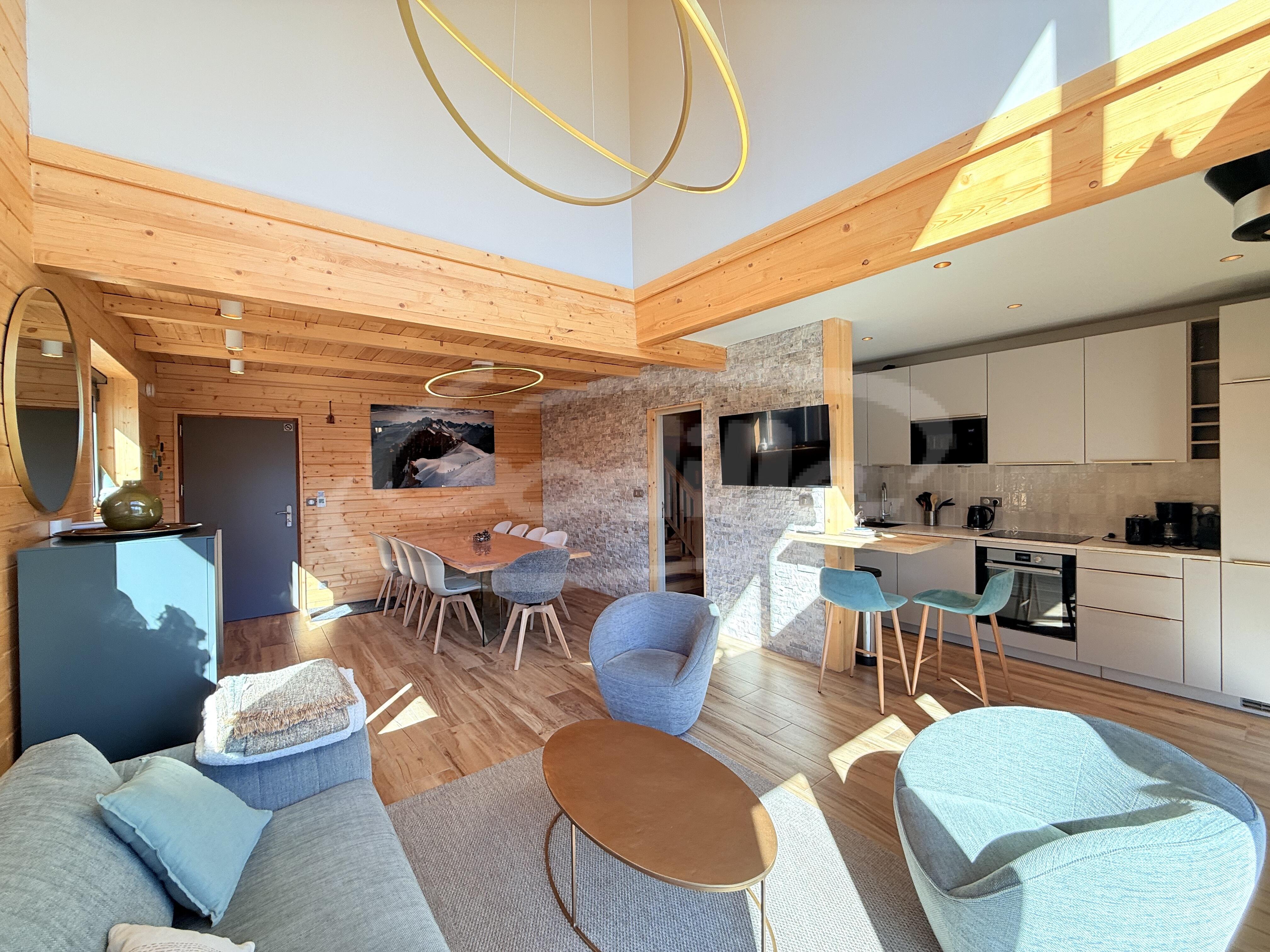 * Séjour/salon spacieux avec espace double hauteur sous toiture : TV HD, canapé et fauteuils, accès au balcon avec mobilier d'extérieur, coin repas avec grande table ;