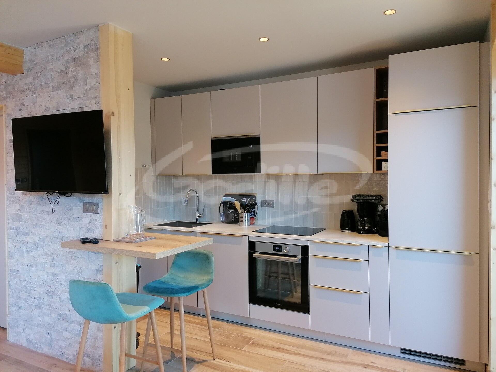 * Cuisine ouverte : lave-vaisselle, four, micro-ondes, plaque vitrocéramique, réfrigérateur, cafetière Nespresso, cafetière filtre, service à fondue, appareil à raclette ;