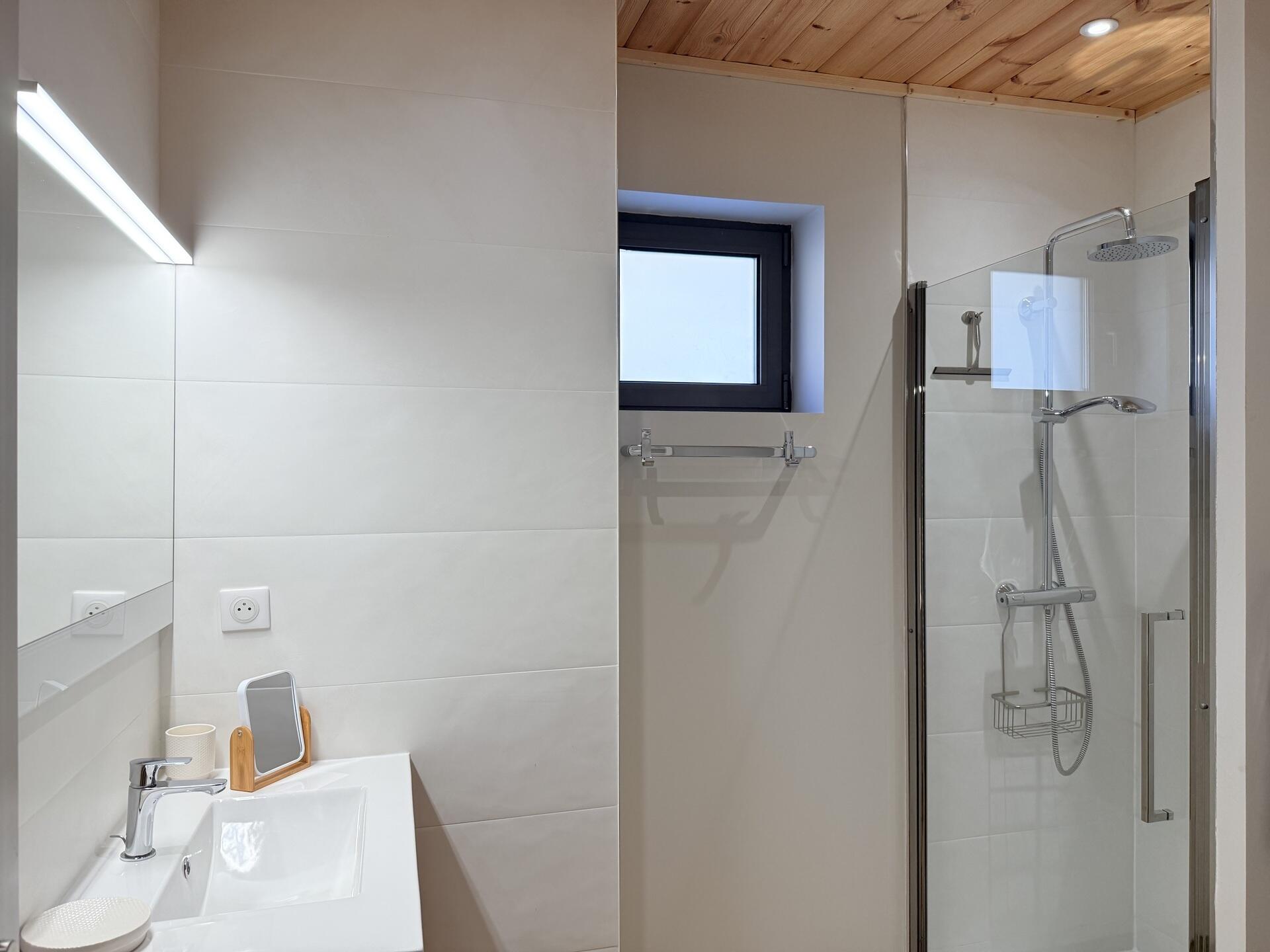 * Salle de bain 1 : douche avec bac extra-plat, lave-linge, meuble simple vasque ;