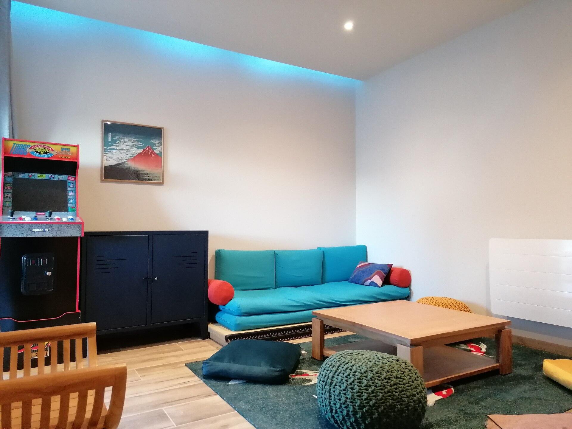 * Salle de jeux et de détente avec canapé, TV HD, arcade de jeux vidéo vintage ;