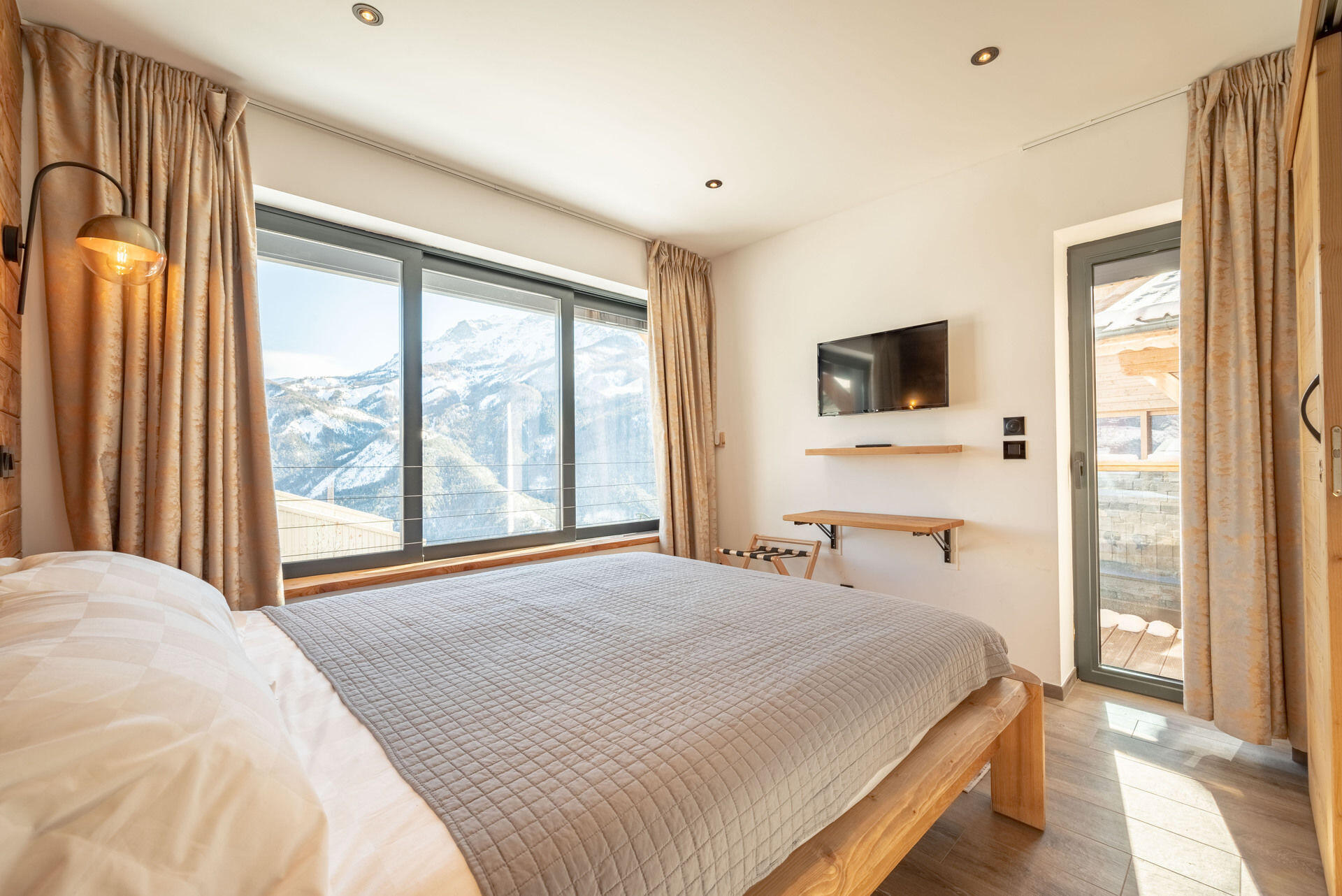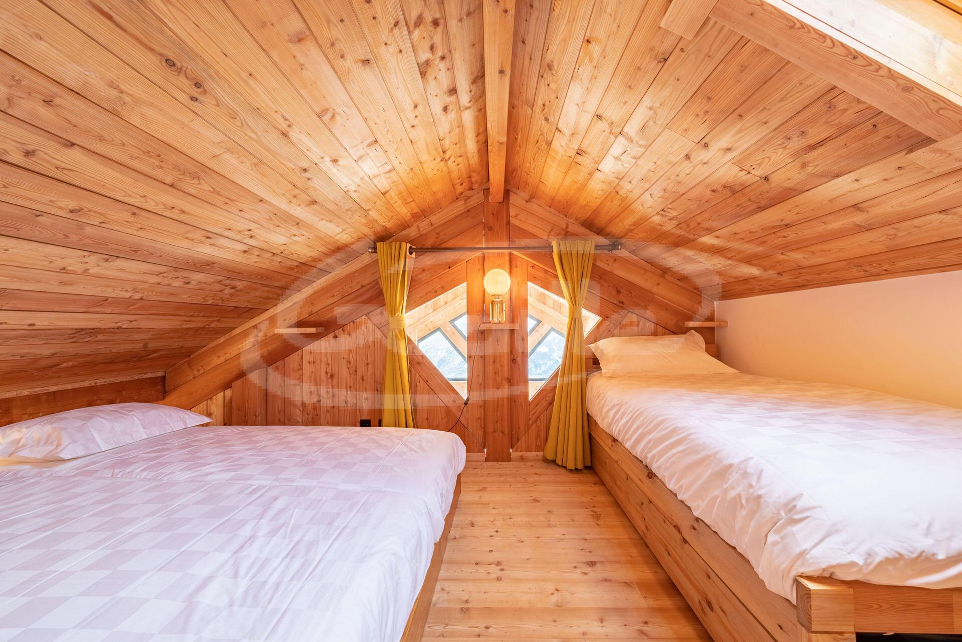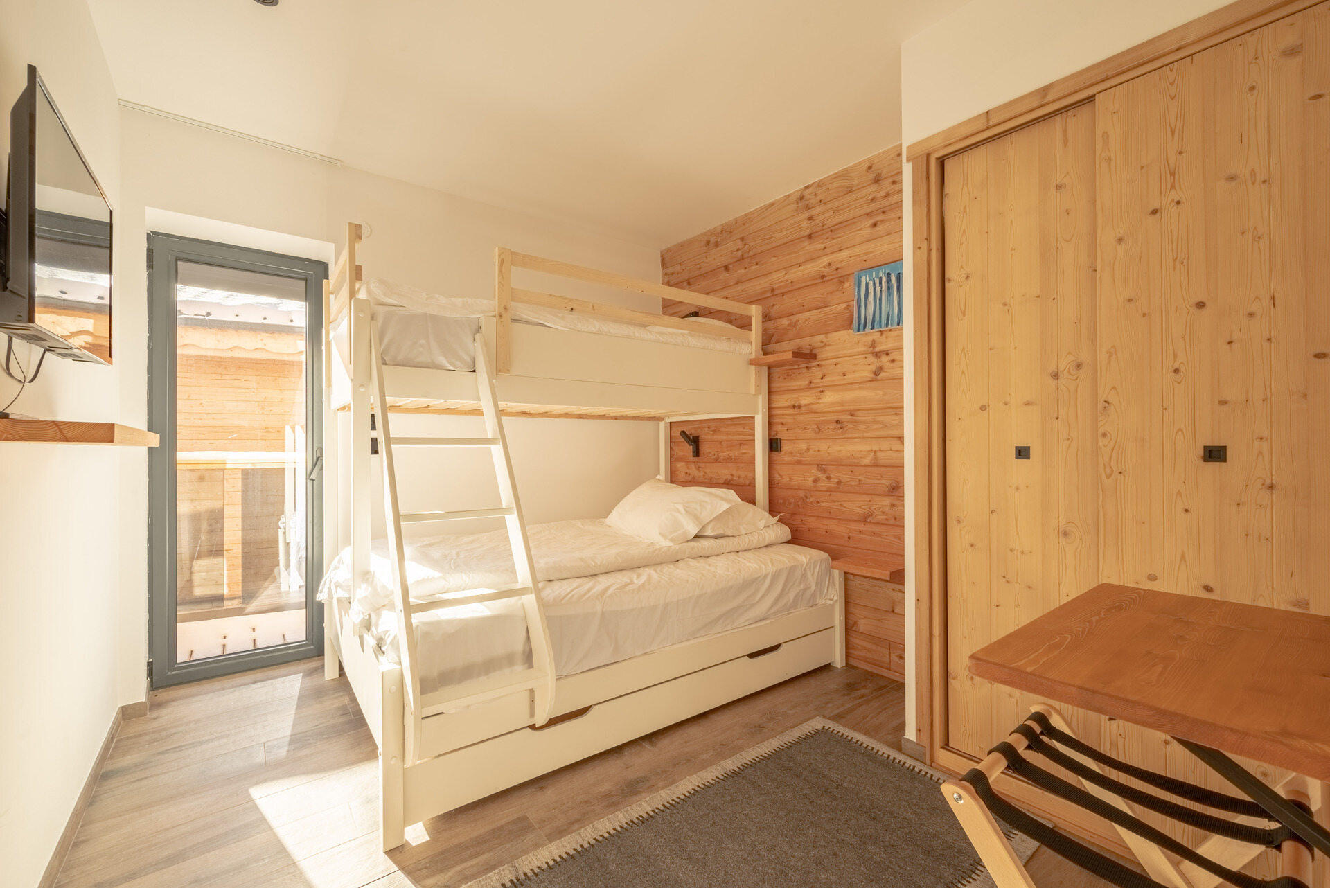* Chambre 2 : lit double 140, lit simple mezzanine 90, TV HD, volet électrique et accès au balcon ;