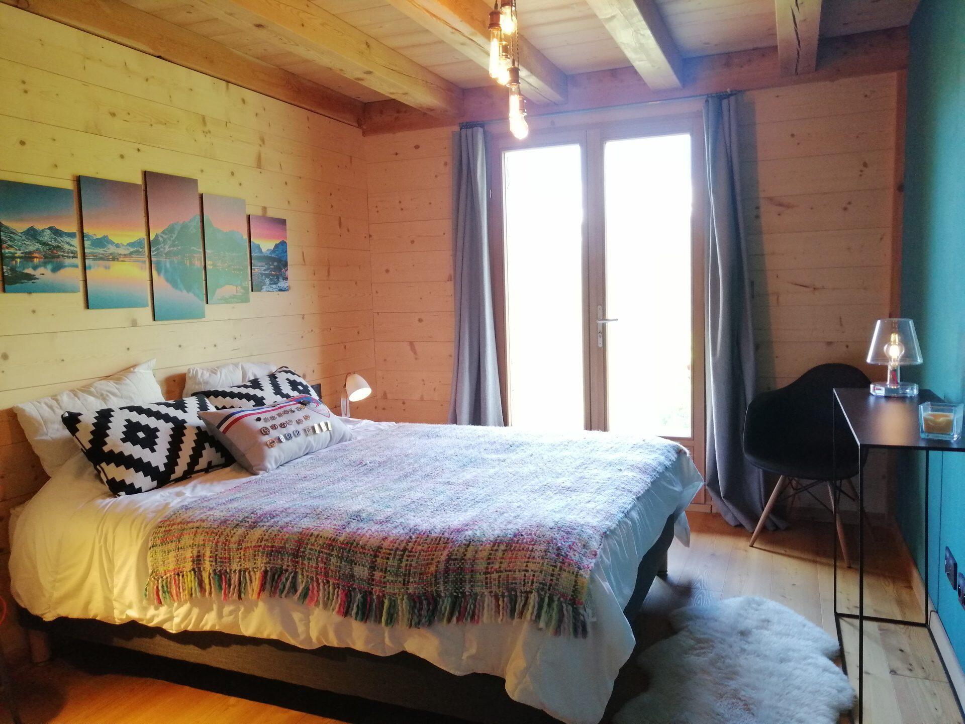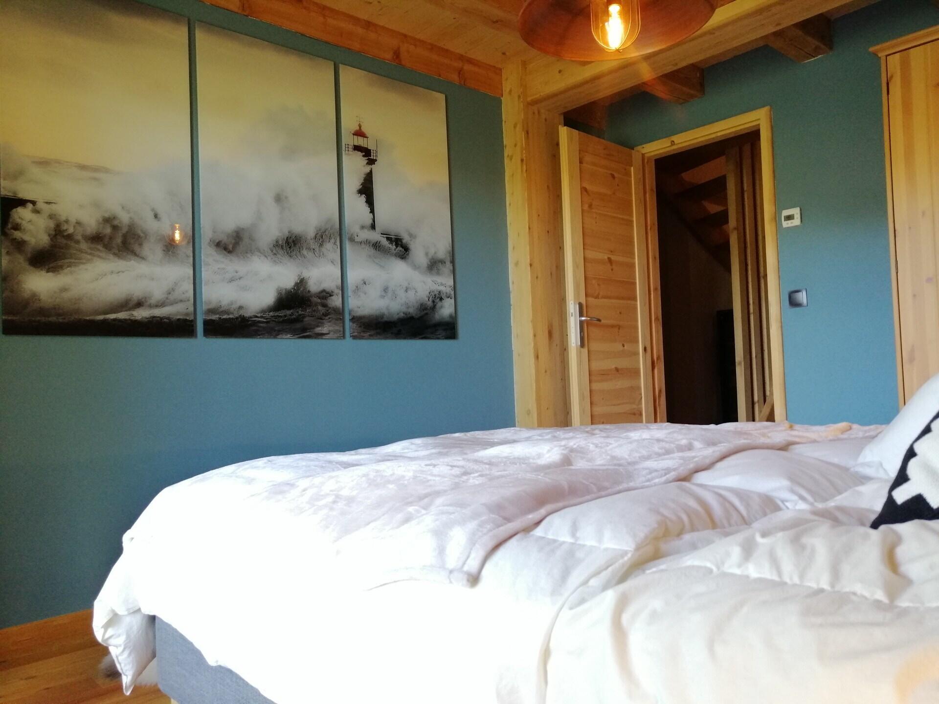 * Chambre 1 : 1 grand lit 160, couette, rangements et accès sur la terrasse en rez-de-jardin, volets en bois ;