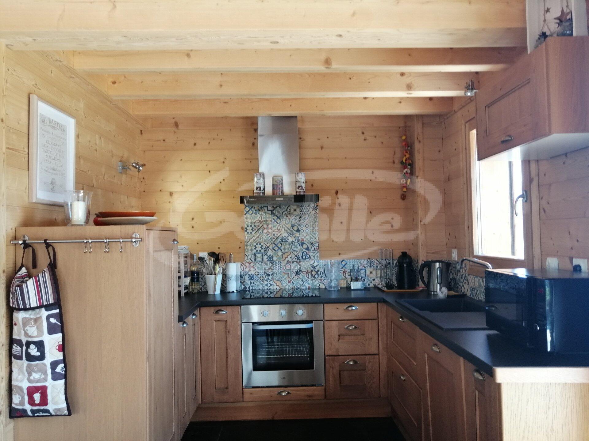 * Séjour / salon : TV en HD, canapé convertible Rapido 140, accès terrasse, coin repas avec table 8 places, volets en bois ;
