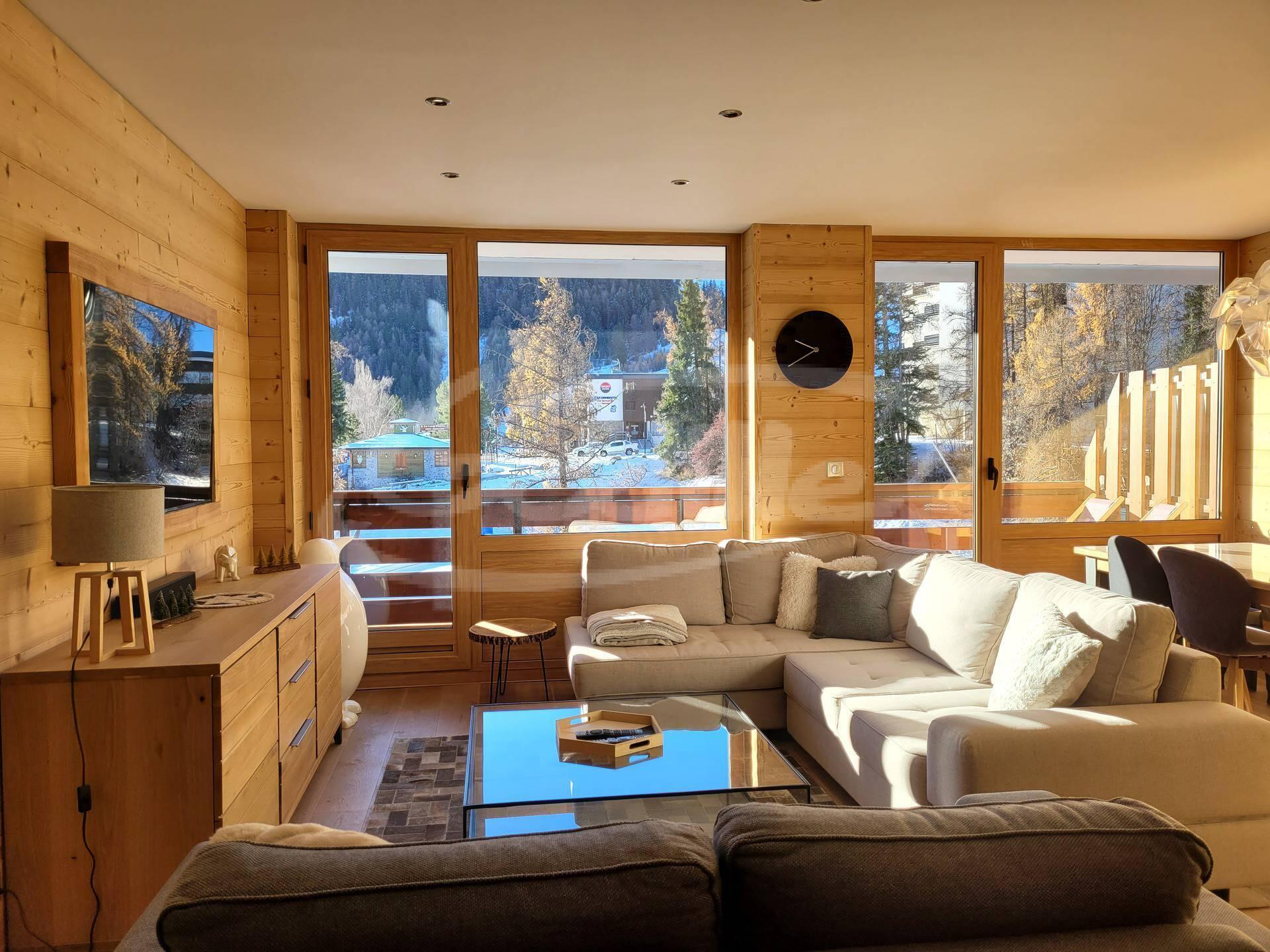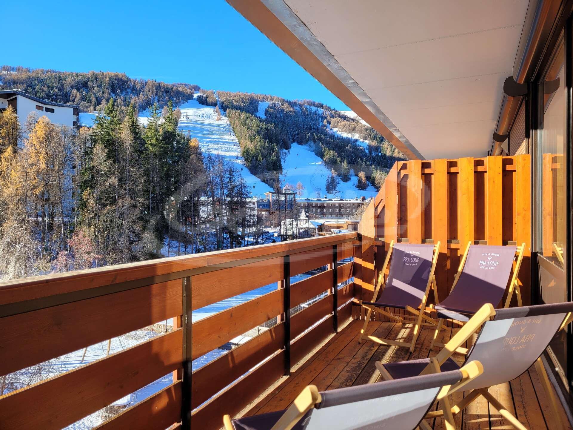 Bel appartement traversant de 4 pièces pour 8 personnes, 86 m² environ, entièrement rénové avec goût. Situé au 3ème étage avec ascenseur. Exposé Sud avec balcon. Depuis le salon vous avez une magnifique vue sur les pistes. Chambres avec vue sur la Vallée.
